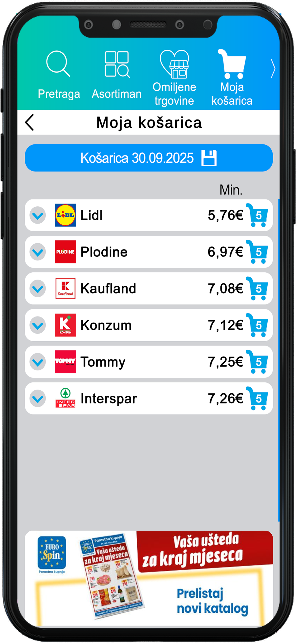 Jednostavno sučelje nudi pretragu i usporedbu svih cijena proizvoda robe široke potrošnje, dodavanje izabranih u košaricu i potom poredbu cijena kupovnih košarica za vodećih desetak trgovaca u Hrvatskoj. Zatim tu je pregled i jednostavna pretraga svih akcijskih kataloga, pohrana vlastitih loyalty kartica i pregled loyalty aplikacija na jednom mjestu.