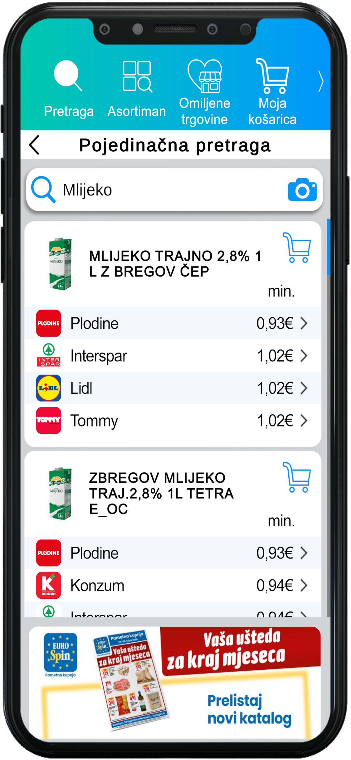 Jednostavno sučelje nudi pretragu i usporedbu svih cijena proizvoda robe široke potrošnje, dodavanje izabranih u košaricu i potom poredbu cijena kupovnih košarica za vodećih desetak trgovaca u Hrvatskoj. Zatim tu je pregled i jednostavna pretraga svih akcijskih kataloga, pohrana vlastitih loyalty kartica i pregled loyalty aplikacija na jednom mjestu.
